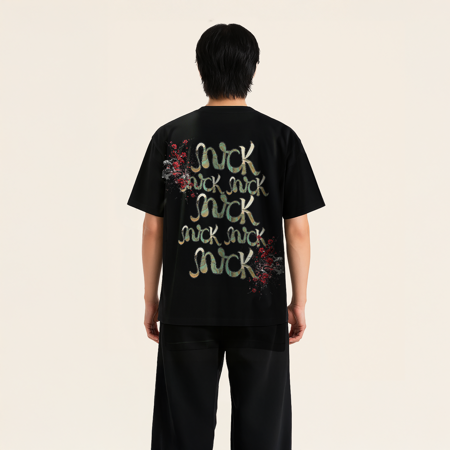 100% cotton black t-shirt featuring a bold layered back print with repeated MVRCK logos cascading downward. The design is accentuated by splashes of red and white textures, adding depth and a raw artistic energy.